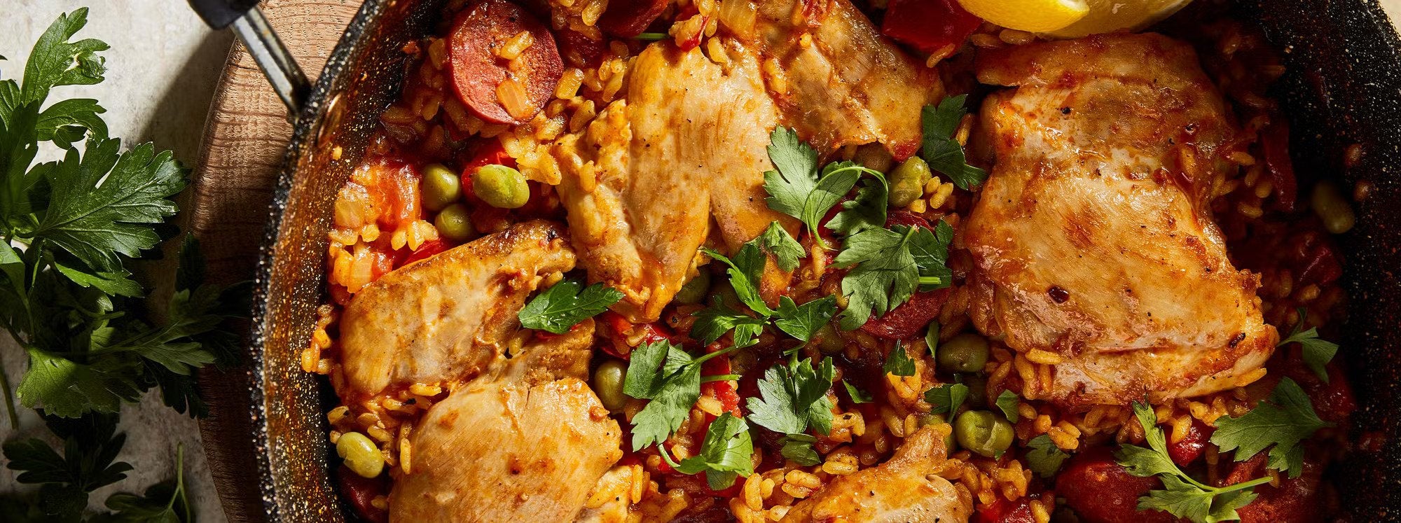 Csempéssz egy kis nyarat az otthonodba egy természetesen fehérjedús, csirkés paella recept segítségével. A paella azon elit ételek egyike, amelyek íze alapvetően egy napsütéses nyaralásra emlékeztet - tökéletesen feldobja az ebédszünetet. Ha becsukod a szemed egy percre, akár úgy is tehetsz, mintha a tengerparton lennél. Csípős chorizo, füstölt paprika, édes paradicsom és lédús lime - egy ízekben gazdag, ínycsiklandó kombináció, amely egész napra boldoggá tesz. Egyébként pedig ez a csirkés paella egy olyan étel, amelyet a hét bármely napján megoszthatsz a barátaiddal.