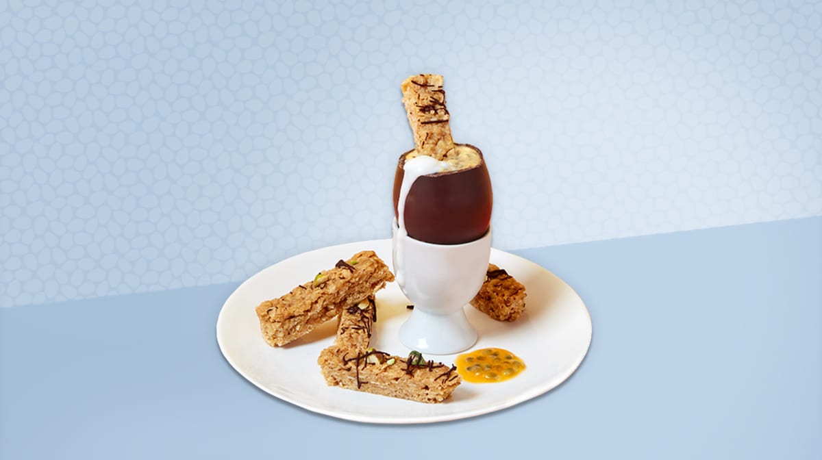 - Keverjük össze a joghurtot és a fehérjét egy tálkában, a maracuját és a szirupot pedig egy másikban! Rétegezzük így bele a tojásba!