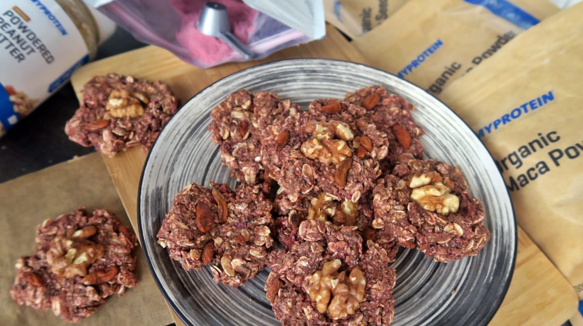 #3 Alaposan összekeverjük a macát, a lucumát, a total nutri reds port, a chia magot, a goji bogyót és a mogyoróvaj port. Végül belekeverjük a pirított zabpelyhet is, és fokozatosan annyi vizet adagolunk a keverékhez, hogy gyúrható masszát kapjunk. Ebből 8 db golyót formázunk, majd sütőpapírral bélelt tepsibe tesszük őket. Egy villával keksz alakúra lapogatjuk a golyókat és 1-1 db diót nyomunk mindegyiknek a közepébe.