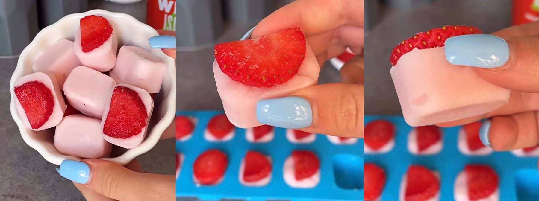 - Egyenletesen oszlasd el a keveréked egy jégkockatartóban, majd díszítsd a tetejét friss eperrel.