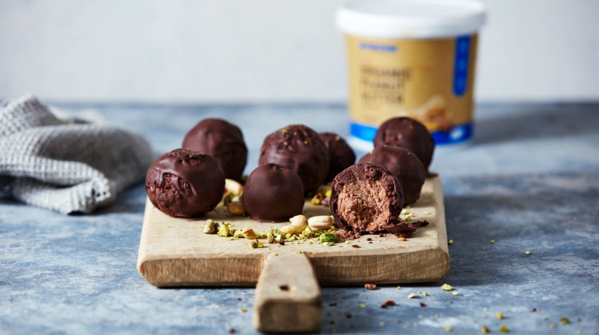 - Vegyük ki a fagyasztóból a mogyoróvajas keveréket, kanalazzunk ki belőle kis adagokat, majd formázzunk kb. 2,5 cm átmérőjű golyókat. A golyókat helyezzük egy kis tálcára, majd tegyük vissza a fagyasztóba 15 percre!