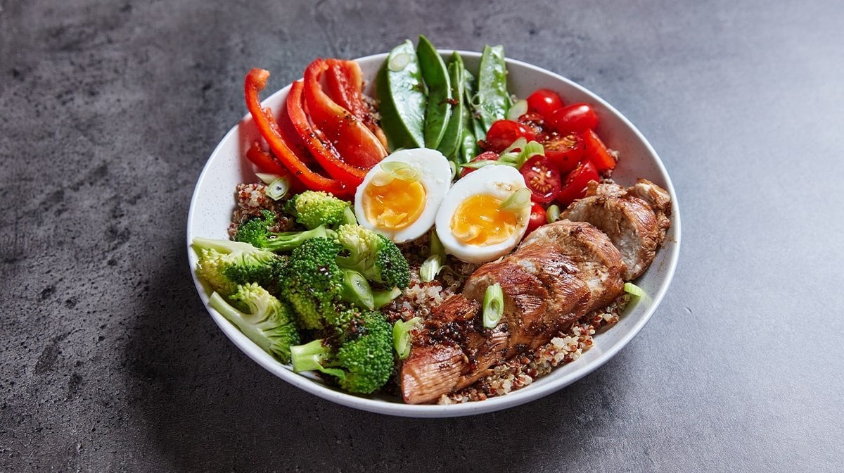 - Állítsd össze a fehérje táladat! Alulra kerüljön a quinoa, majd tedd rá a brokkolit, a cukorborsót, a kaliforniai paprikát és a koktélparadicsomokat! Ezt követően tedd a tálra a szeletelt csirkemellet és a megpucolt, félbevágott tojást is! A maradék marináddal öntsd meg kissé, majd díszítsd apróra vágott csemegehagymával! Jó étvágyat!