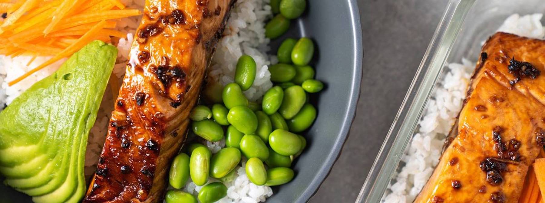 - Ha minden kész és a lazac is megsült, tegyünk mindent egy tálba az azonnali fogyasztáshoz, vagy egy ételtárolóba, ha a következő napi ebédre szánjuk. Kezdjük a ragacsos sushi rizs ággyal, majd helyezzük rá a pácolt lazackockákat az előkészített zöldségekkel és edamame babbal együtt. Tápláló és annyira finom!