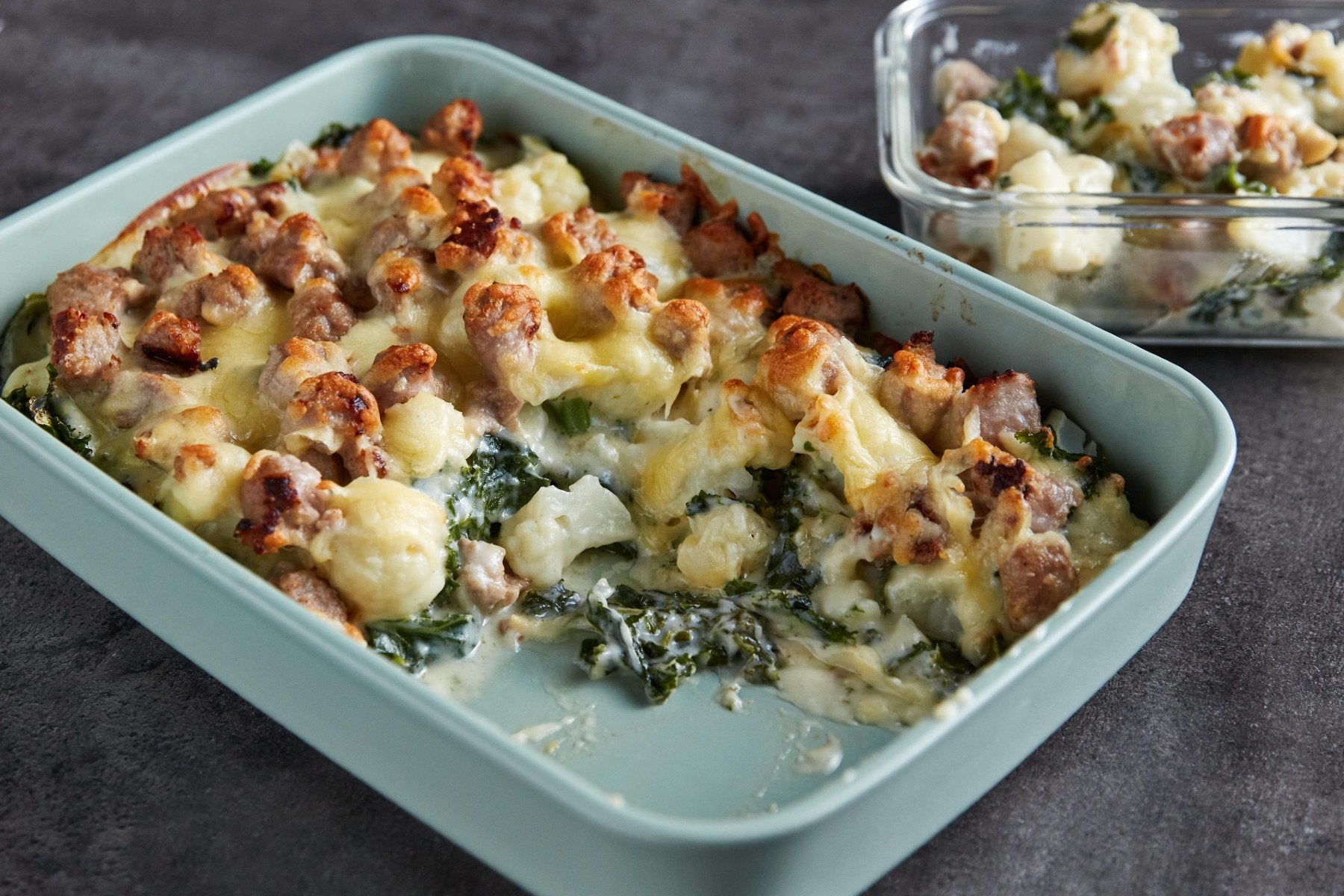 Melegítsd elő a sütőt 200°C-ra! Első lépésként szedd virágaira a karfiolt, és tedd egy edény forrásban lévő vízbe! Főzd 6 percig, majd add hozzá az apróra vágott kelkáposztát, és főzd együtt további 2 percig! Szűrd le, majd helyezd egy tepsibe vagy jénai tálba! Ezt követően hevítsd fel a olívaolajat egy tapadásmentes edényben, és tedd bele a kibelezett kolbász darabkákat! Süsd néhány percig, amíg mindenhol aranybarnára nem pirul, majd amint elkészült, tedd félre! - Töröld át az edényt, és tedd bele a zsírszegény olívapástétomot, majd melegítsd közepes lángon! Amint elolvadt, keverd hozzá a lisztet, hogy egy sűrű, krémes állagot kapj!