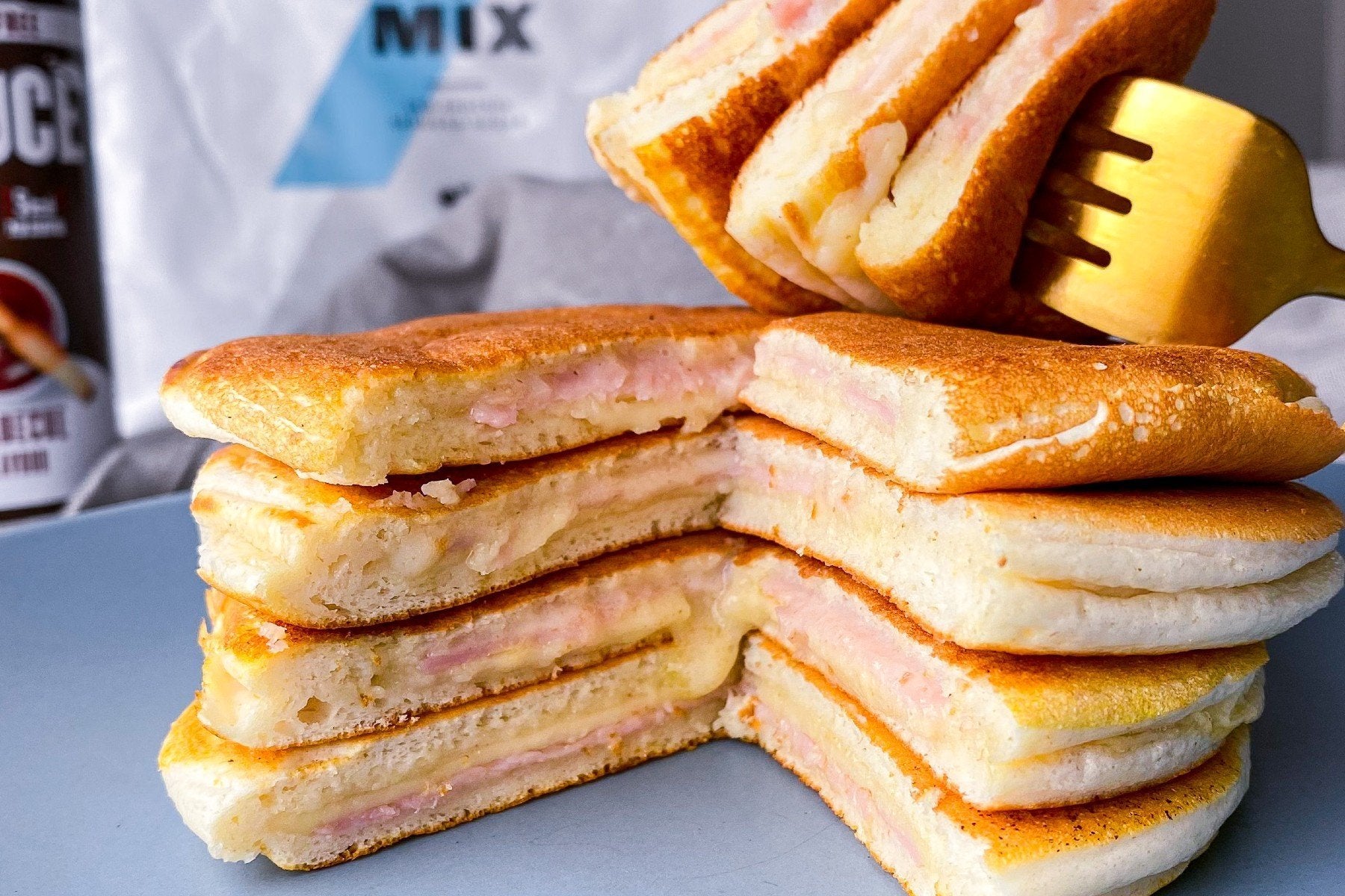 Egy tálba adagoljuk ki a Protein Pancake Mixet, majd apránként adjuk hozzá a tejet, amíg a tészta össze nem áll. - Kezdjük el kisütni a körülbelül 2 evőkanál tésztát forró serpenyőben, közben tegyük rá a sonka- és sajtszeleteket, a másik palacsintával pedig fedjük le. Hagyjuk 1-2 percig sülni, majd megfordíthatjuk.