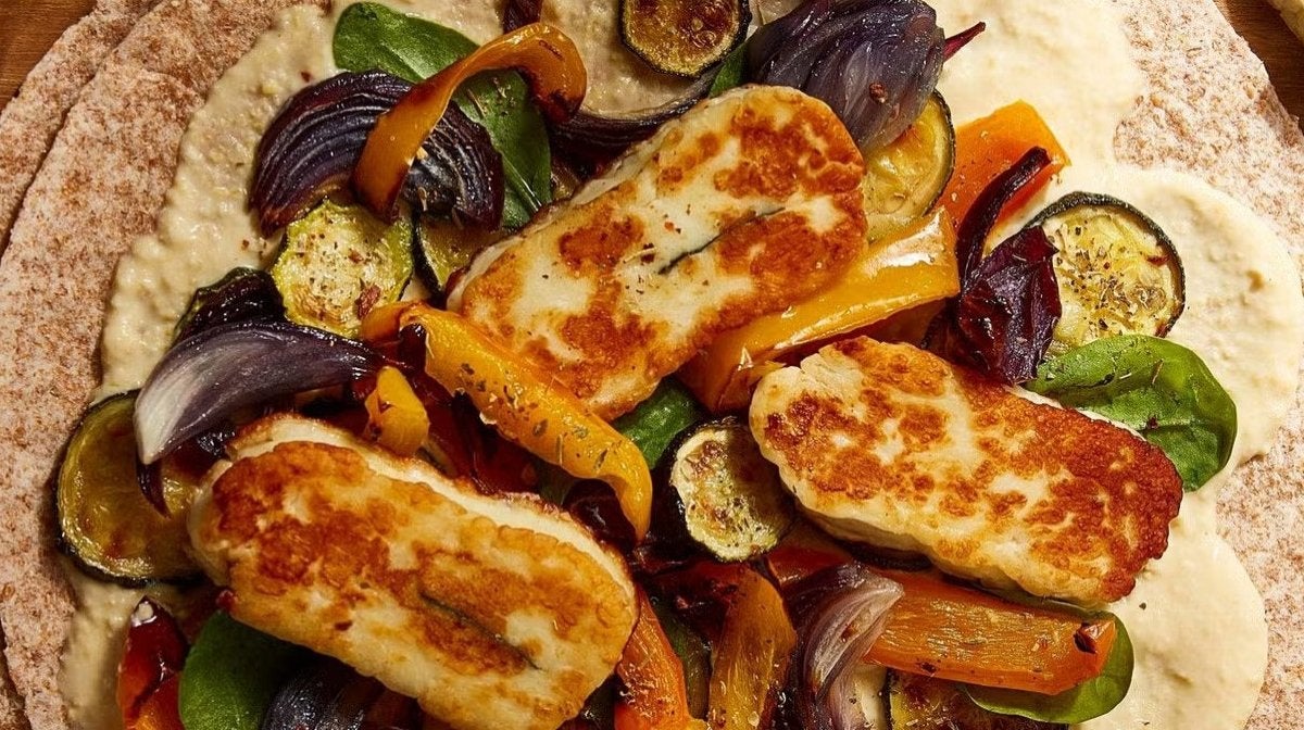 - Most pedig állítsd össze a wrapjaidat - egy wrapra kenj körülbelül 1-2 evőkanál humuszt, majd tedd rá a sült zöldség, a halloumi és a maréknyi spenót és salátalevél negyedét. Ezután készíts szoros wrapot úgy, hogy először a tortilla két ellentétes oldalát hajtod be, majd alulról tekerd fel. Ismételd meg ezt a maradék wrapokkal is.